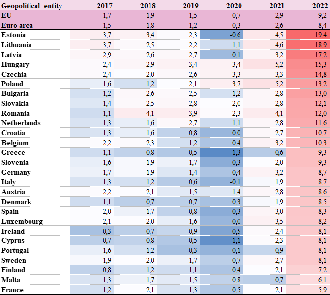 (järjestatud kõrgeimast madalamaks 2022. aasta inflatsiooni põhjal). Allikas: Eurostat