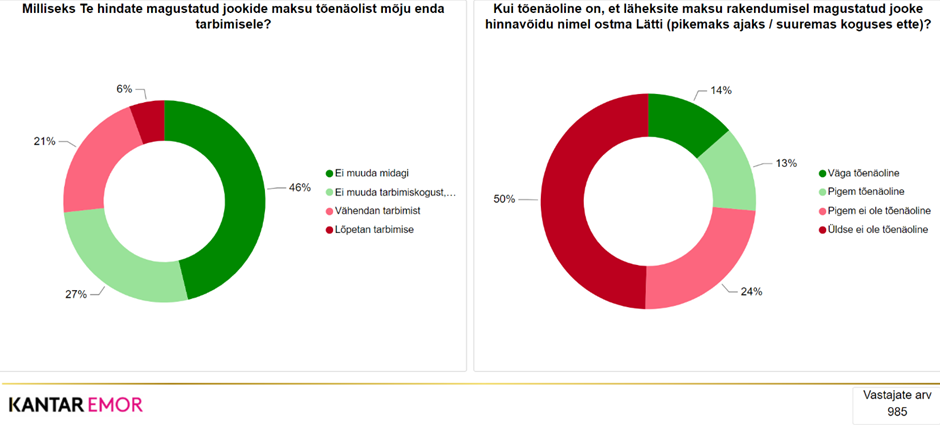 Täiendavalt viidi Eesti Karastusjookide Tootjate Liidu tellimusel läbi sotsioloogiline uuring, et saada tagasisidet Eesti elanike, perede ja majapidamiste hoiakutest ning võimalikust käitumuslikust tarbimiselastsusest maksustatavate toodete hüppeliselt kasvavate hindade suhtes. Eesti elanike tagasiside on ühemõtteliselt väga kriitiline. Küsitlustöö viis läbi uuringufirma Kantar Emor perioodil 14.03–21.03.2024. Uuringu kokkuvõtet tutvustatakse koostöös Kantariga, ent selle põhilised järeldused on lihtsad: 2/3 esindusliku valimiga uuringus osalenuist on maksu vastu, sarnane suurusjärk inimesi on ka magusainetega magustatud ent suhkruvabade jookide maksustamise vastu ning ligi 30% vastanuist peab võimalikuks, et hakkab maksustatud jooke endale varuma piirikaubanduse kaudu.
